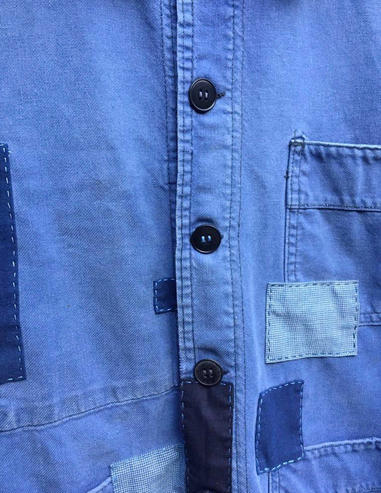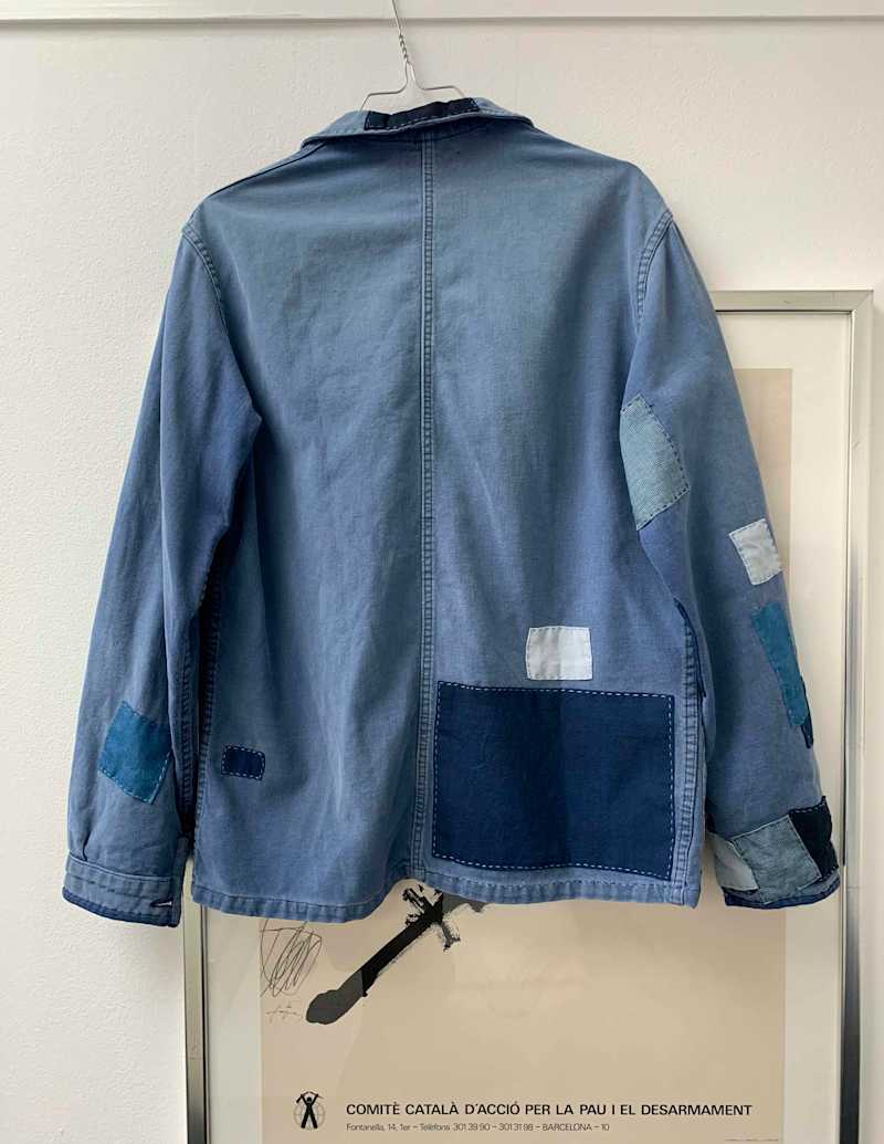 Honoured in a series of patchwork jackets since 2016, the blue workwear jacket is hand-stitched with patches covering the garment, underlining the craft and labour so closely connected to its original purpose, altering something precious and intimately familiar.